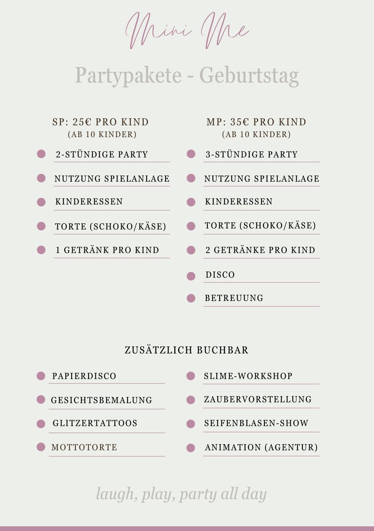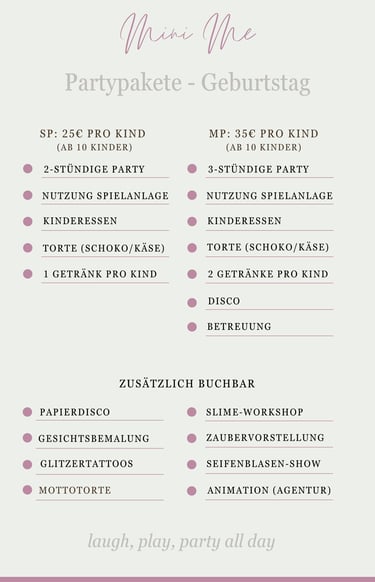PS: Neben den aufgelisteten Paketen bieten wir auch hochindividualisierbare Feiern an. Kontaktiert uns und wir machen Euren Traumgeburtstag wahr!